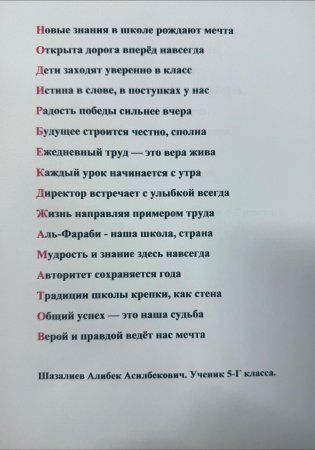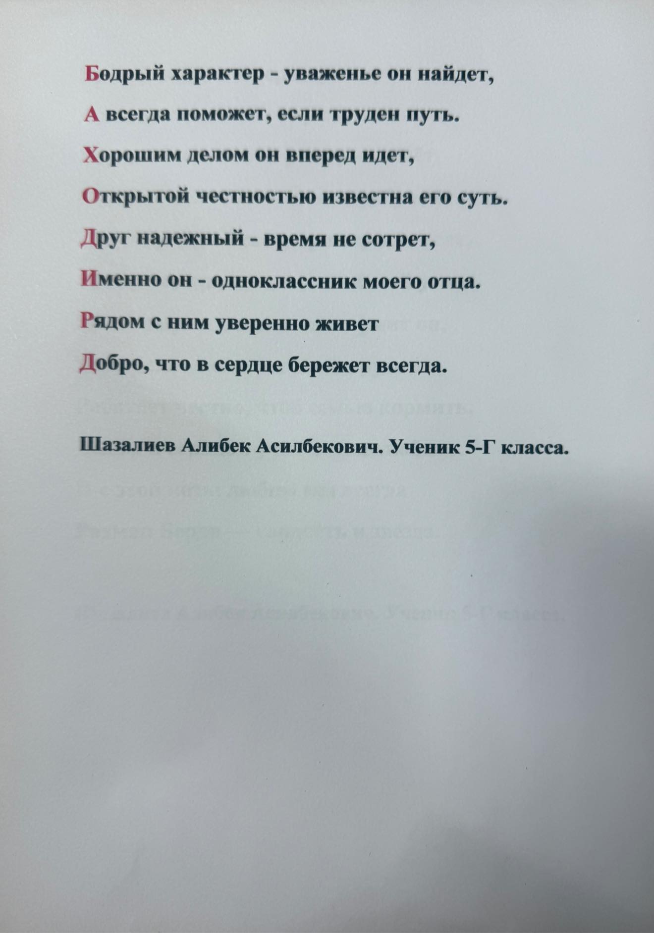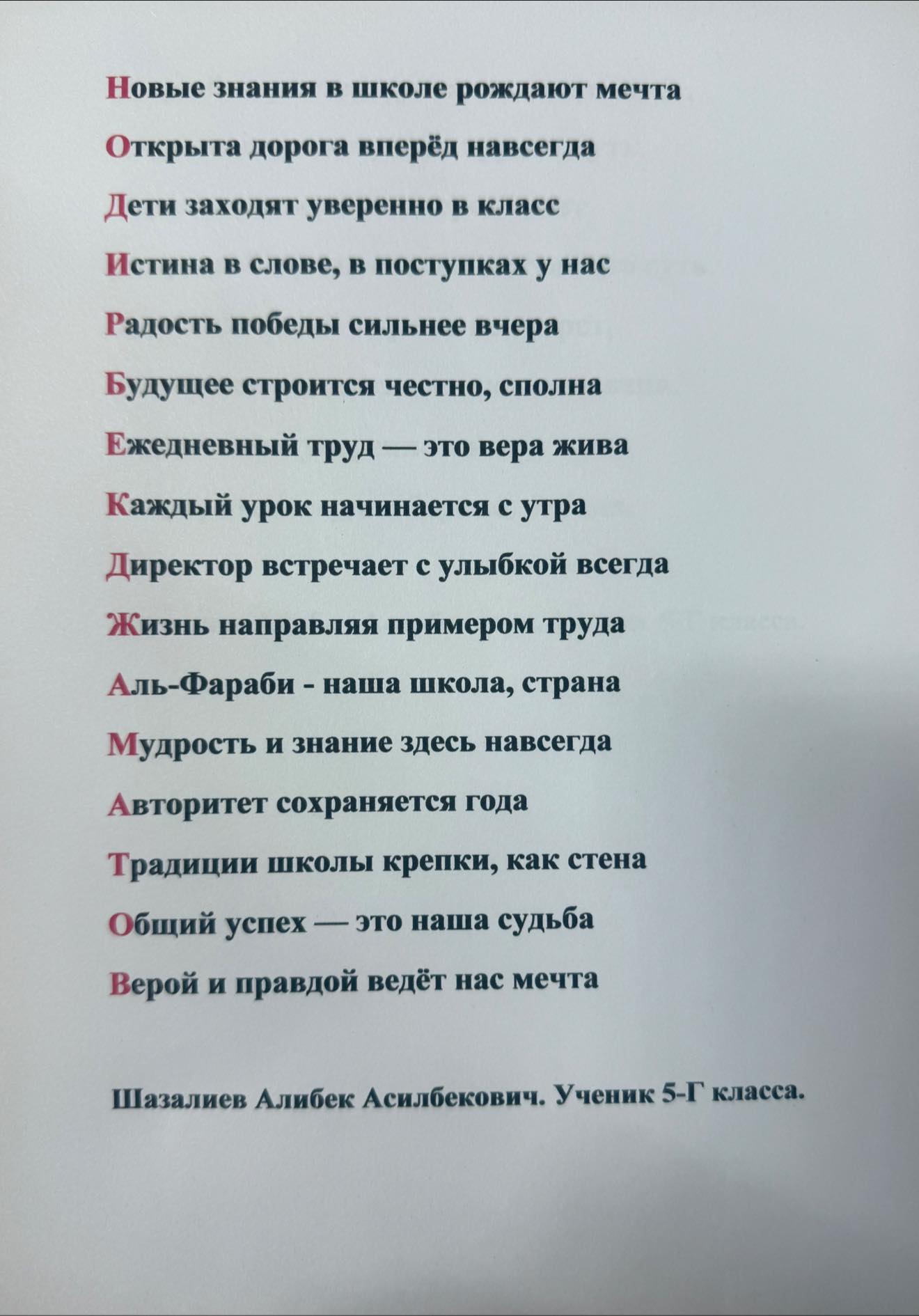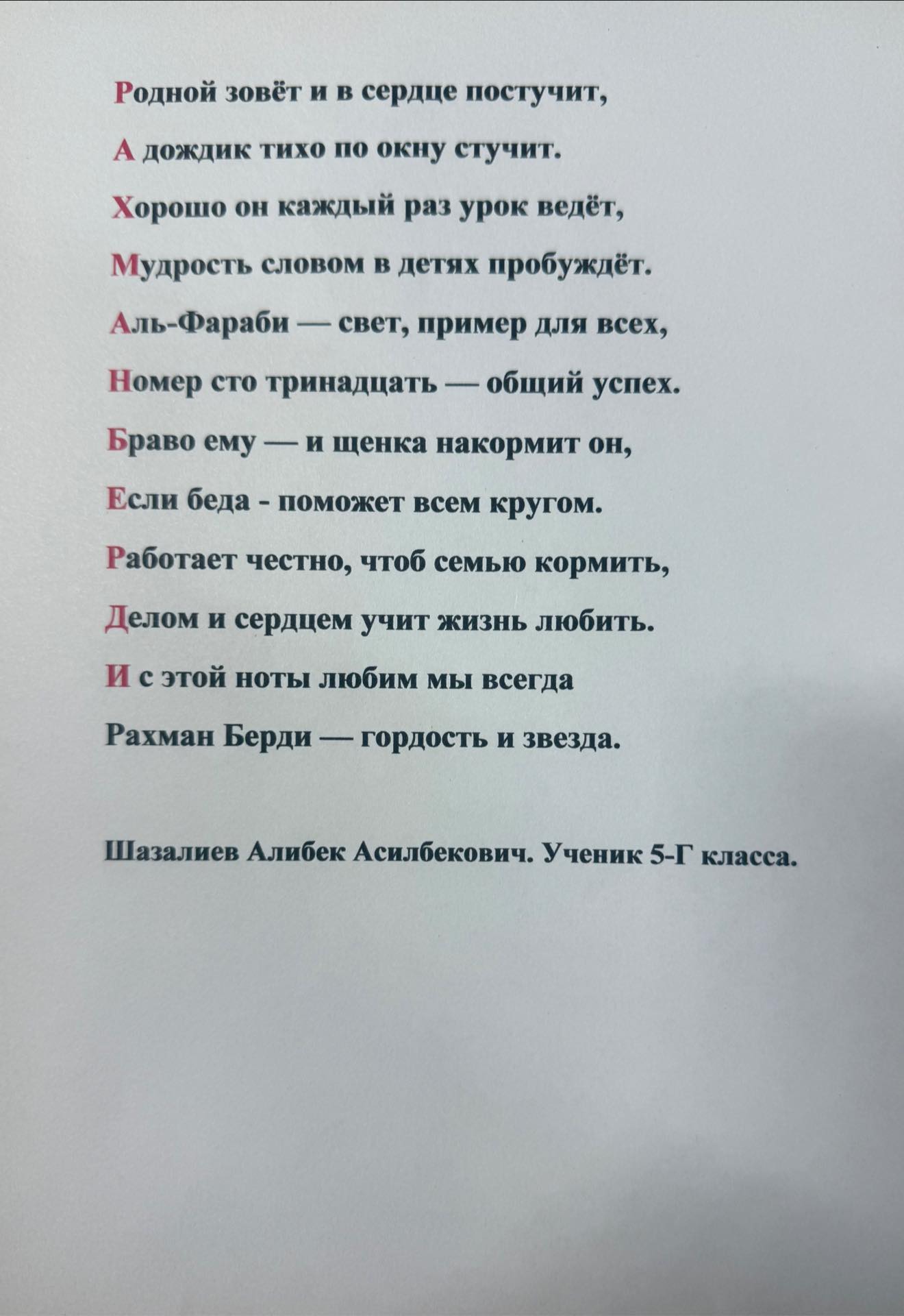 № 113 Әл-Фараби атындағы жалпы орта білім беретін мектептің 5-«Г» сынып оқушысы Шазалиев Алибек Асилбековыч мектеп директоры Нодирбек Мирхашимович Джаматовқа және тәрбие істері жөніндегі орынбасарлары Базарбаев Баходир Боранбаевич және Эгамбердиев Рахманберди Октамбаевичке арнап өлең жолдарын арнады. Өзіңнің өлең жолдары арқылы мектеп директоры мен орынбасарларына деген құрметіні білдіре алғаны – үлкен өнеге. Оқушымызға оқу жолында табыс, шығармашылық шабыт, биік мақсаттарға жетуіне тілектеспіз. Өнерге, білімге құштарлығы арта берсін, әрқашан мектептің мақтанышы болсын.